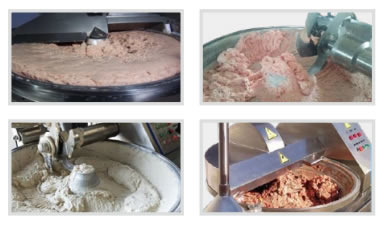 1. 斬拌機(jī)利用斬刀高速旋轉(zhuǎn)的斬切作用,將肉塊,碎肉,脂肪等主要原料精細(xì)的斬切成肉餡或肉泥,同時(shí)將其它原 料如水、冰片、輔料一起攪拌成均勻的乳狀物。斬刀高速旋轉(zhuǎn),可以縮短運(yùn)行時(shí)間,減少物料發(fā)熱量,保持餡料的 天然色澤、彈性、出品率和產(chǎn)品的保質(zhì)期。此外,該設(shè)備還適合用于魚類、水果、蔬菜的粉碎加工。